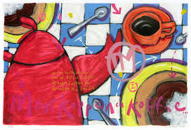 Vrolijke zeefdruk van Selwyn Senatori in zeer beperkte oplage van slechts 100 stuks. Senatori, wel bekend om zijn vrolijke eettafrelen, heeft deze zeefdruk in 2004 geproduceerd. Ingelijst met zwarte bloklijst.