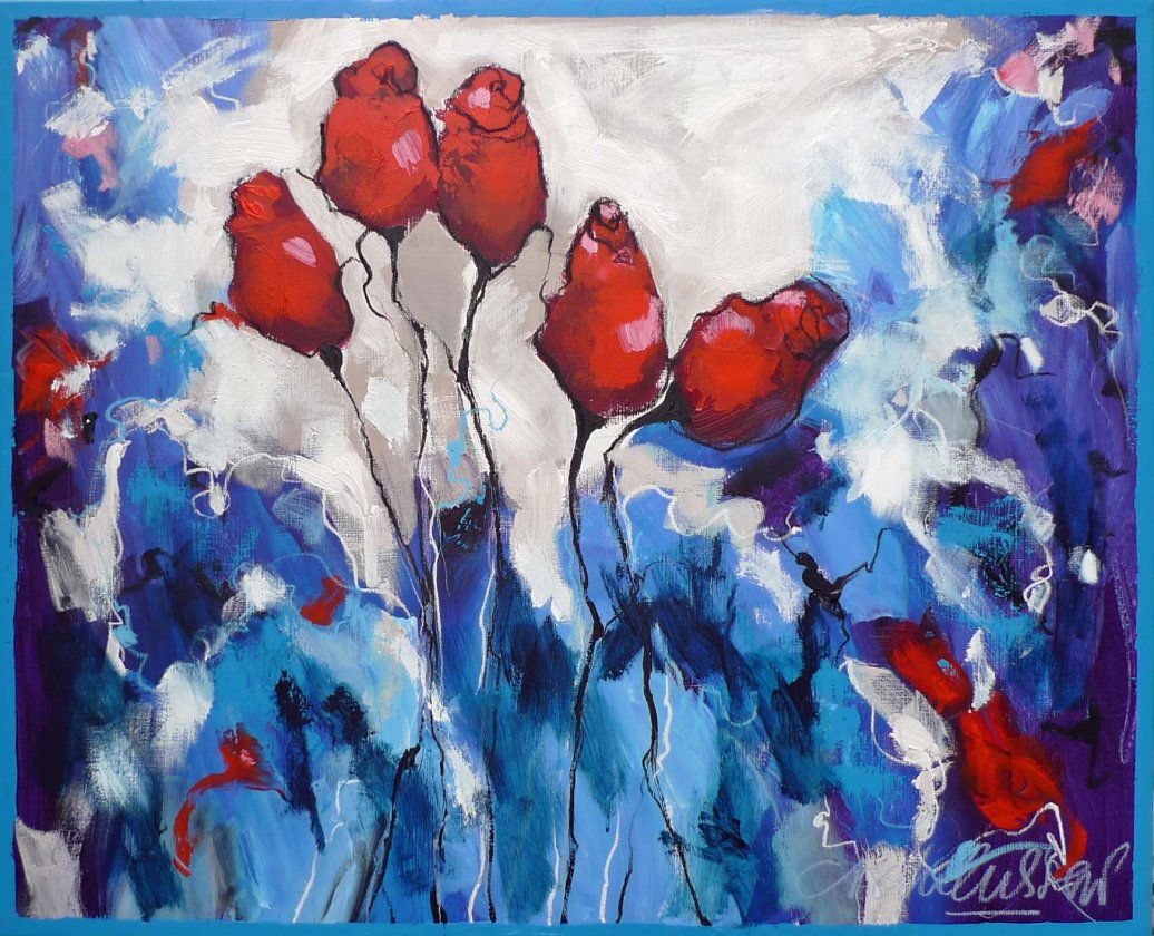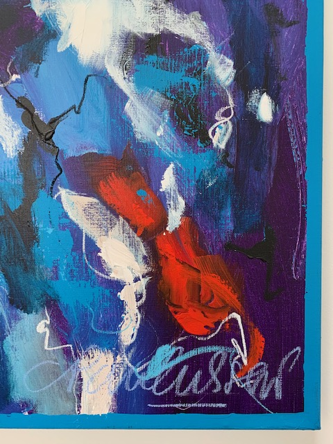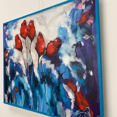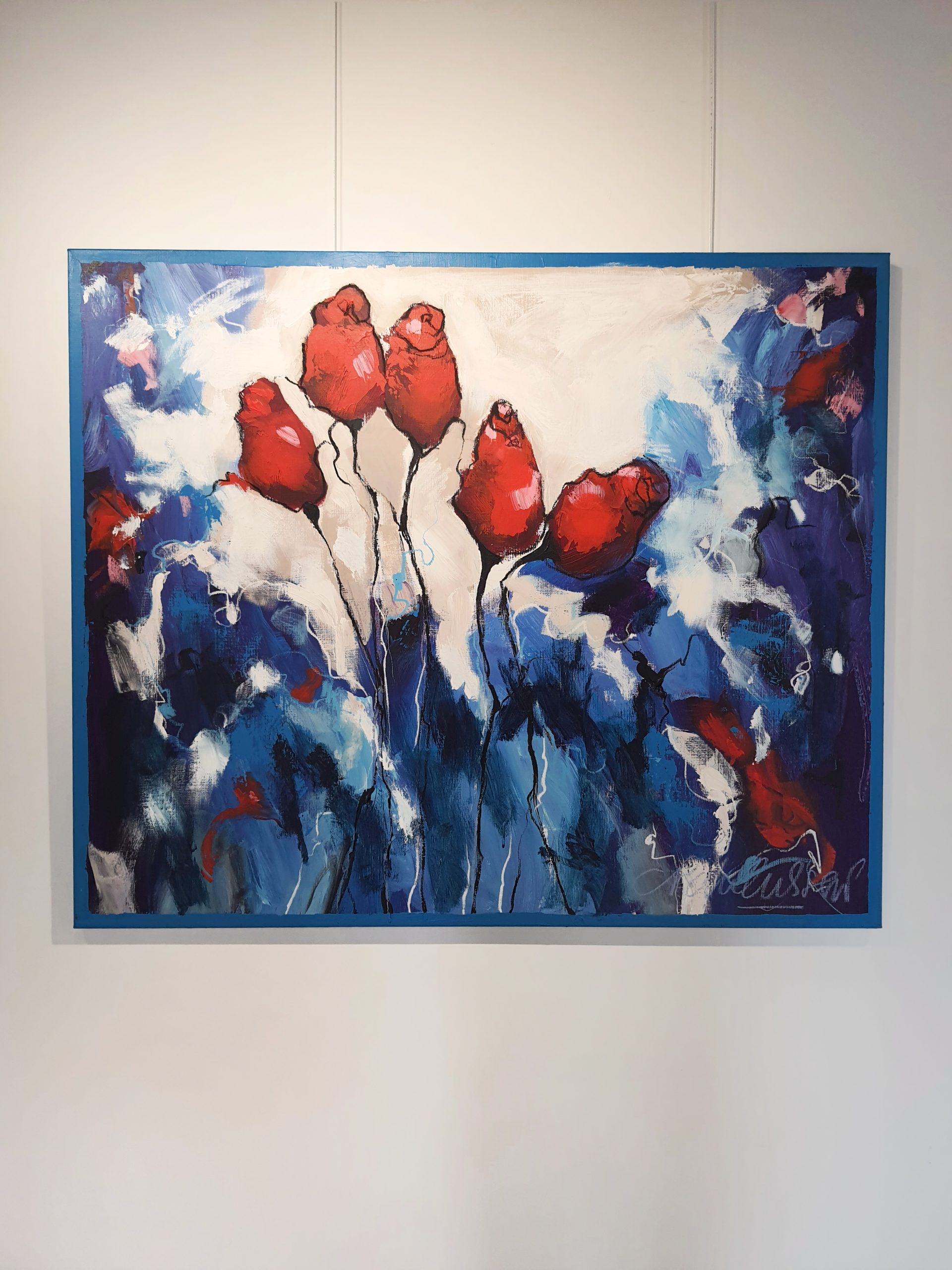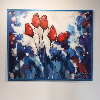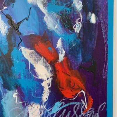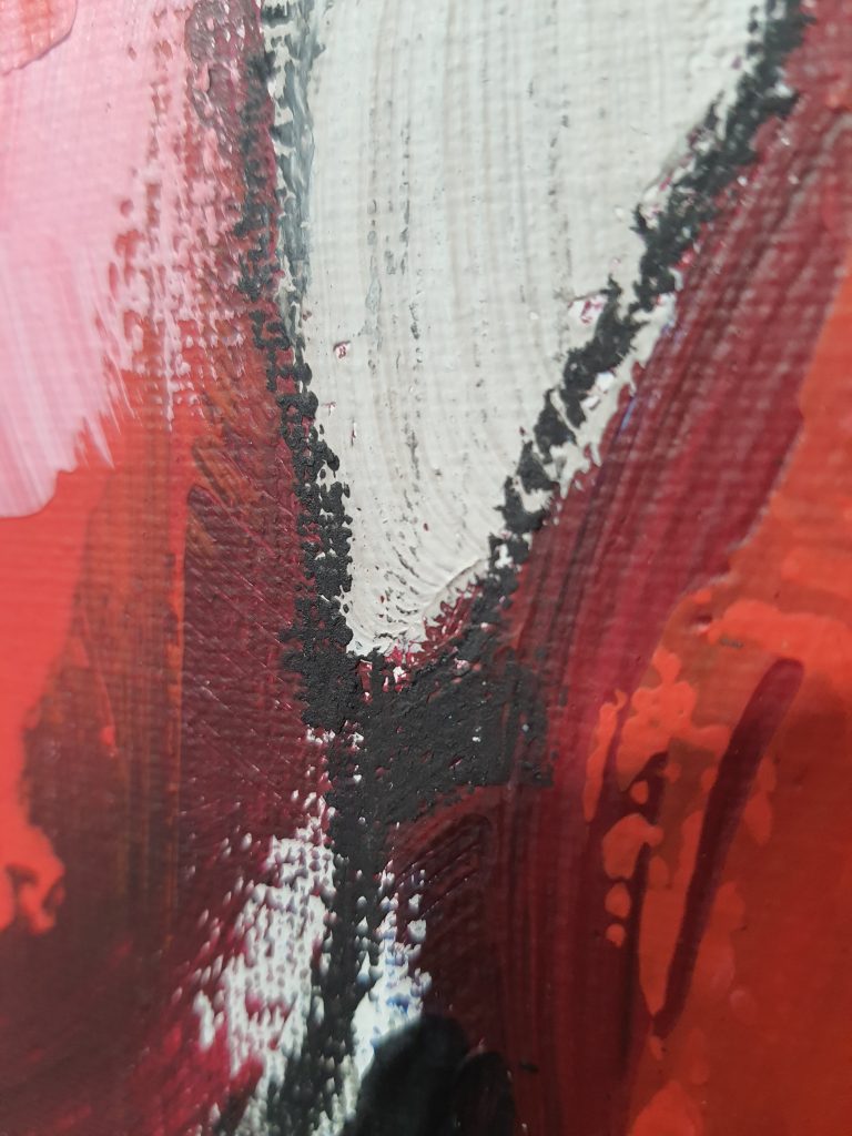 Het stuk is door de kunstenares met gemengde technieken op een stevige linnen doek opgezet en kent een prachtige dynamiek en een intrigerend spel van gelaagdheid, subtiele figuratie en kleurgebruik.