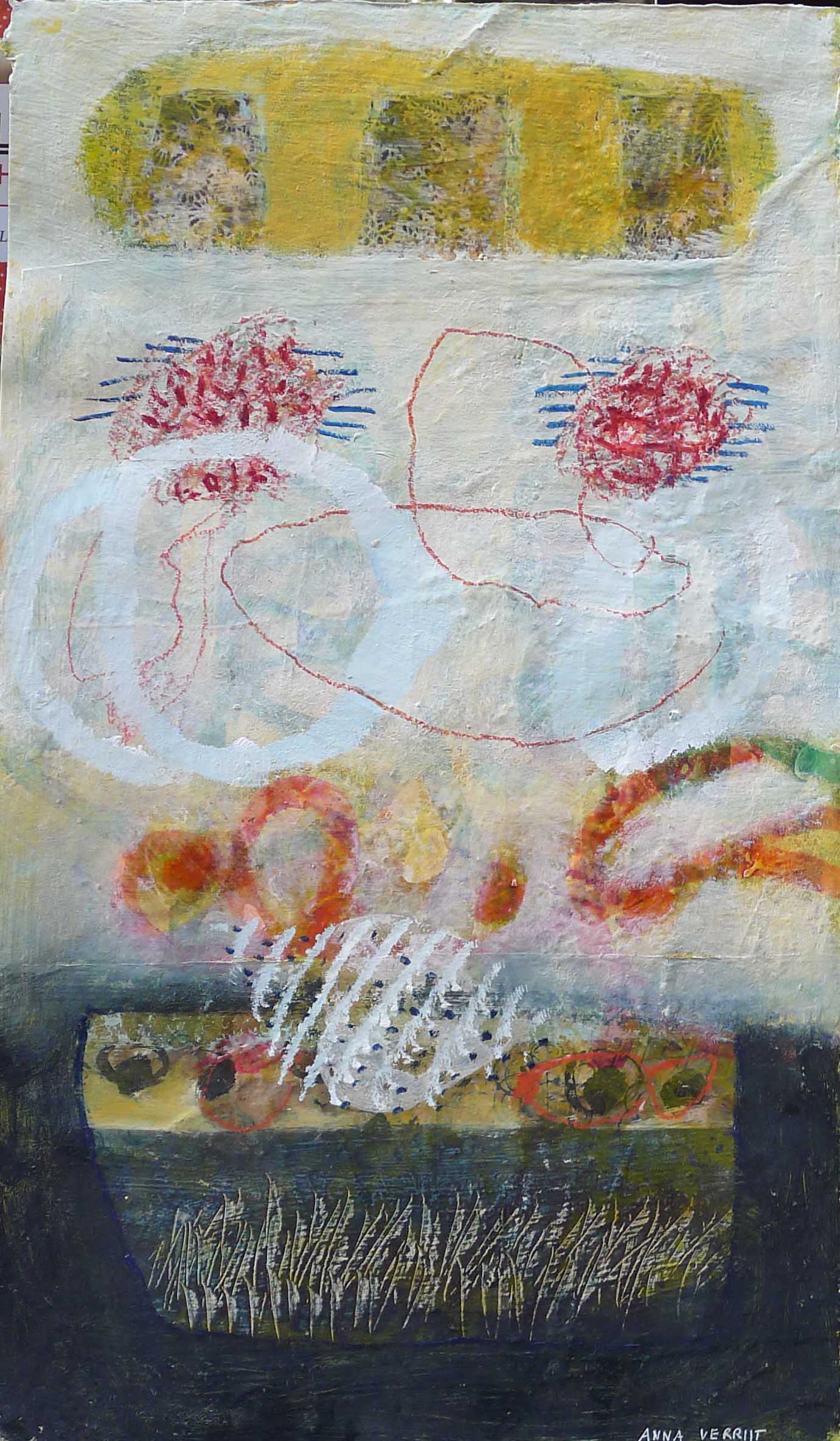 1 van een prachtige serie werken van Anna Verrijt. De basis voor de werken vormt dik 1000 grams handgeschept kartonpapier. De bladen zijn door de kunstenares met gemengde technieken en reliefspecie bewerkt en opgebouwd waarbij Anna Verrijt zich goed heeft laten inspireren door de daar voorhanden zijnde unieke materialen, kleurpigmenten en nieuwe technieken. De stukken zijn opgebouwd uit vele transparante lagen, die allemaal min of meer zichtbaar zijn en zo is prachtig de ontstaansgeschiedenis van het kunstwerk af te lezen. De werken laten bij elke aanblik nieuwe ontwikkelingen zien en blijven de kijker daardoor keer op keer boeien!