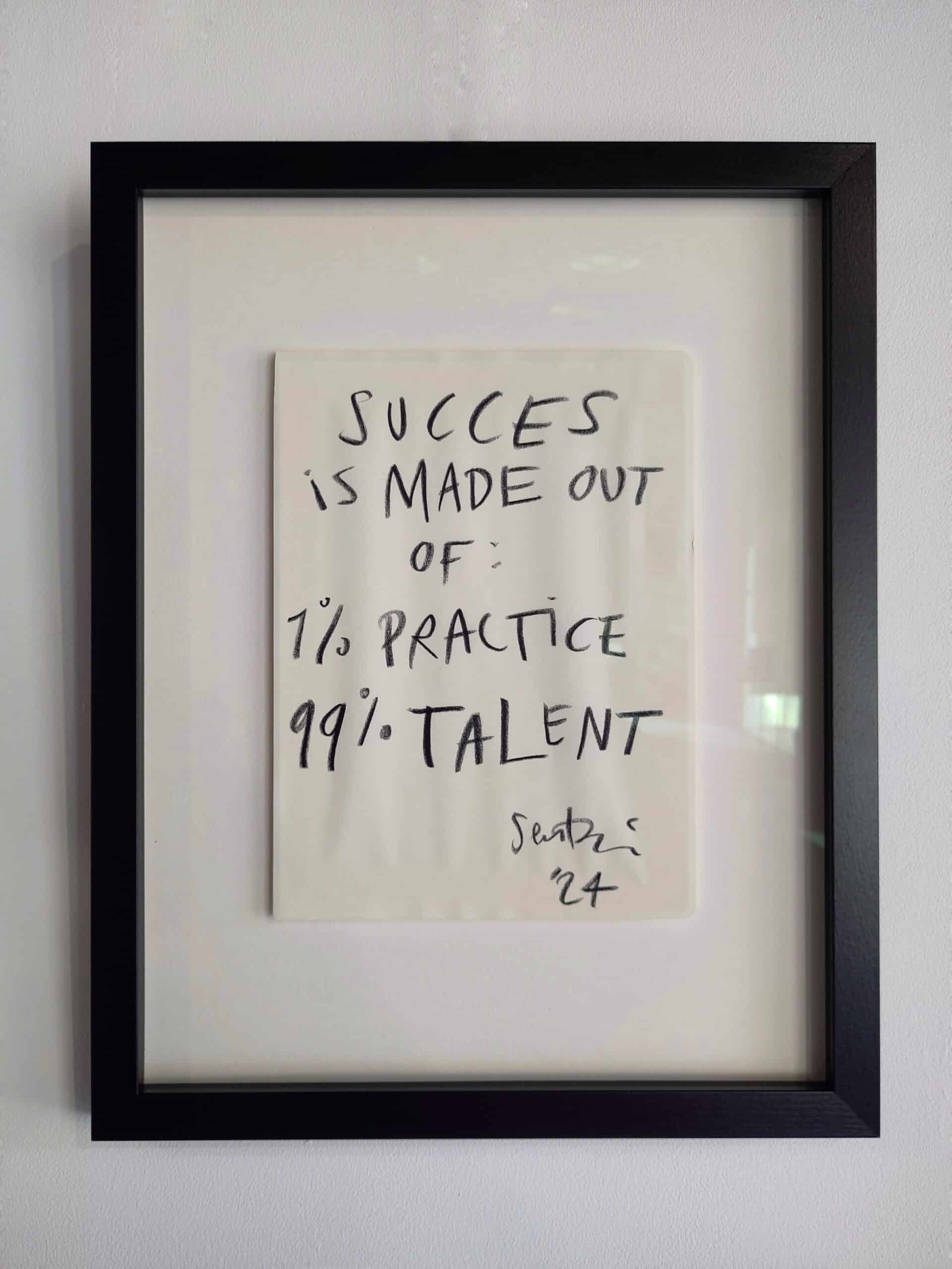 Originele schets op Moleskine papier uit 1 van de privé schetsboeken van Selwyn Senatori. Zwevend opgelegd in een handgemaakte zwarte houten lijst achter anti-reflectie en UV werend museum glas.
