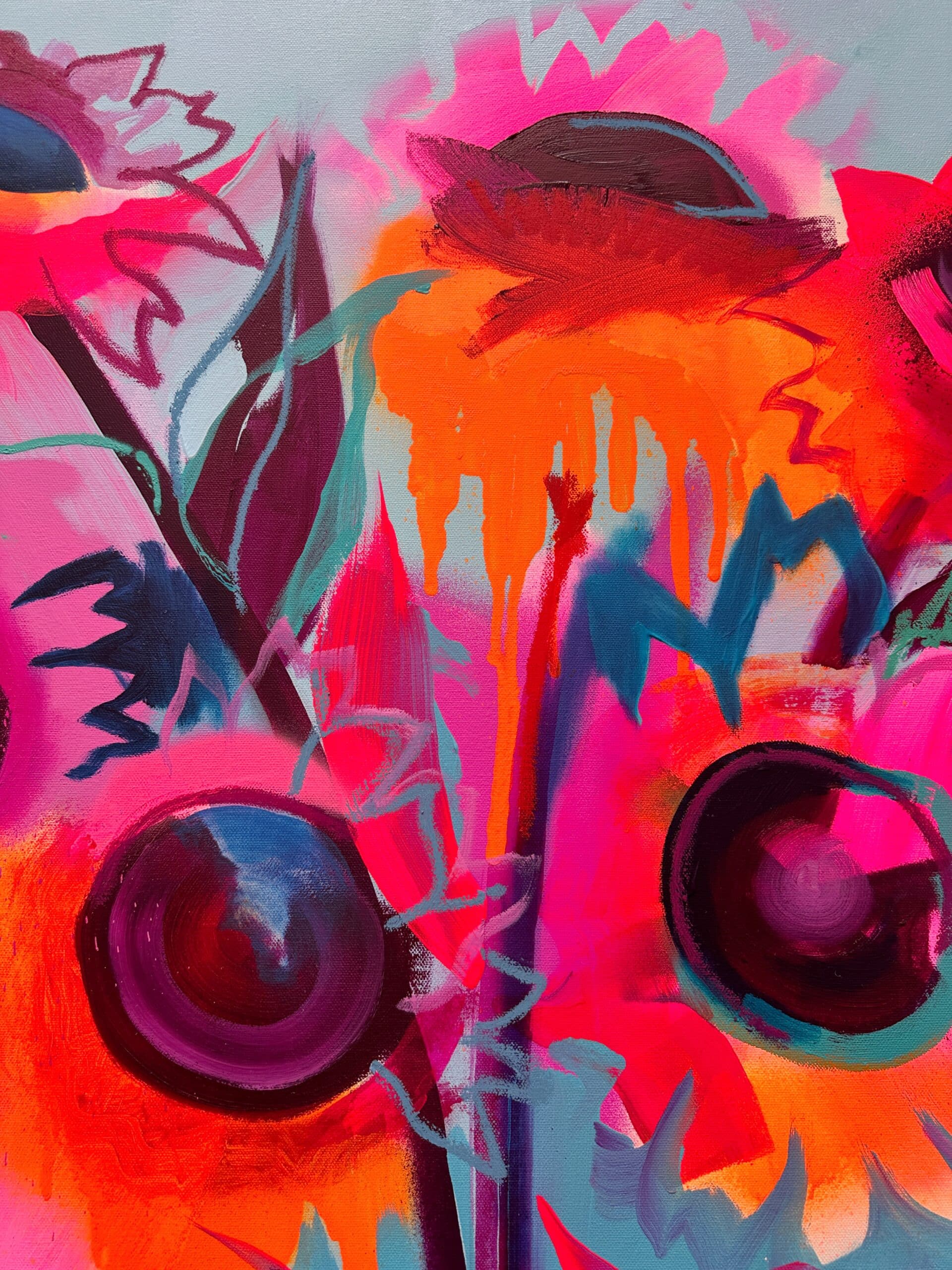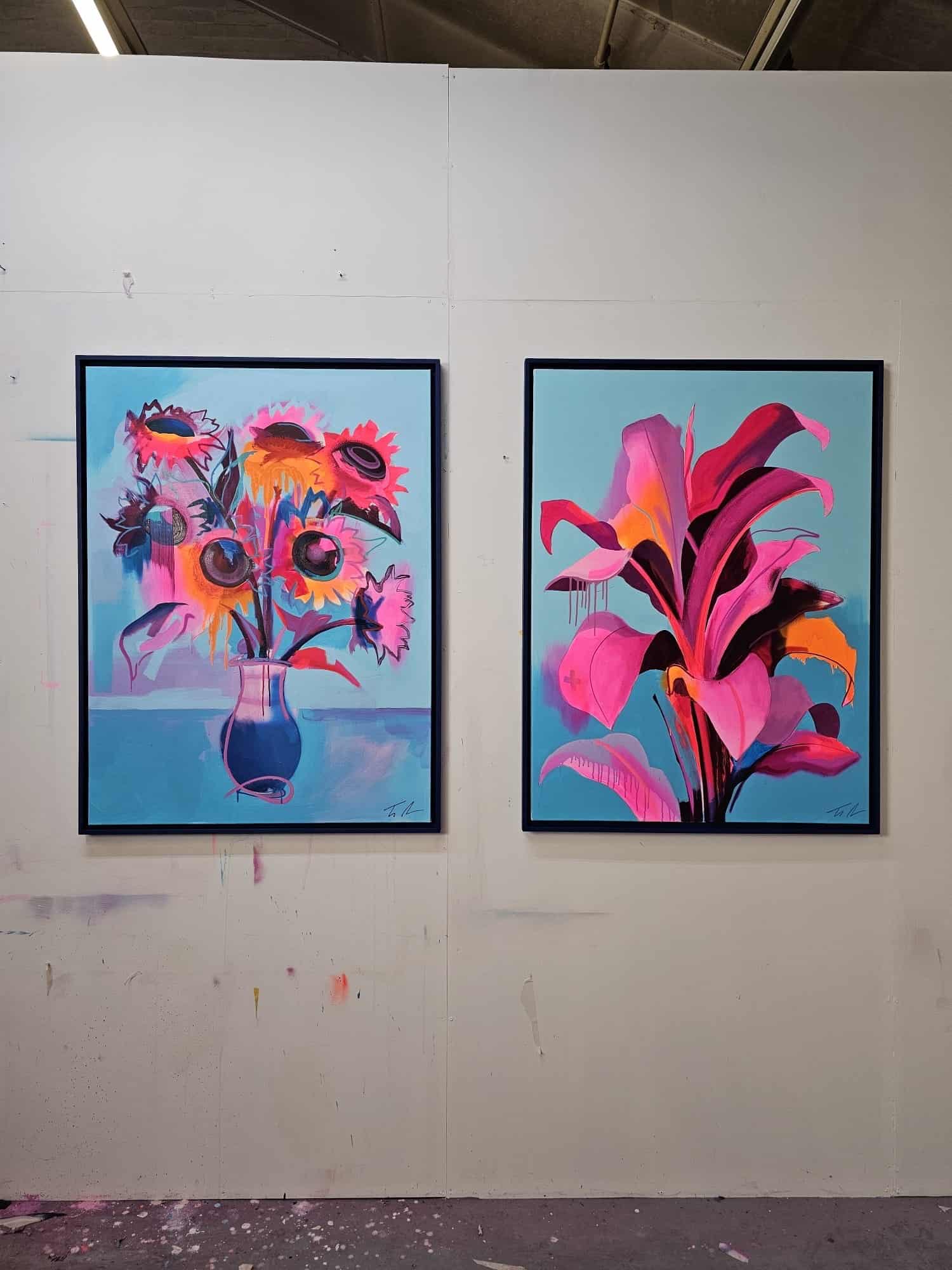 Fowler takes inspiration from exotic and migratory plants reflecting his own DNA, from west Africa, via the Caribbean to the UK. He subverts traditional and contemporary methods of applying oil, acrylic, spray, enamel and graffiti inks using brushes, different aperture caps and marker paint mops to orchestrate purposeful marks, strokes, drips, scrapes and smears across the canvas whilst constructing his exciting and dynamic artworks.