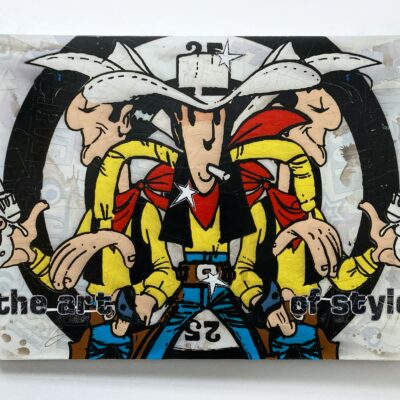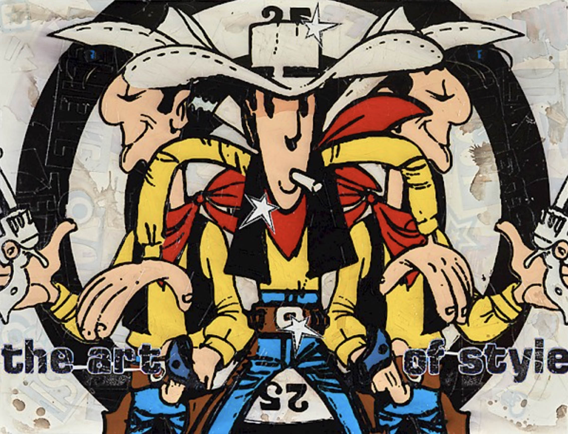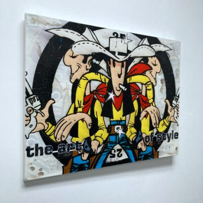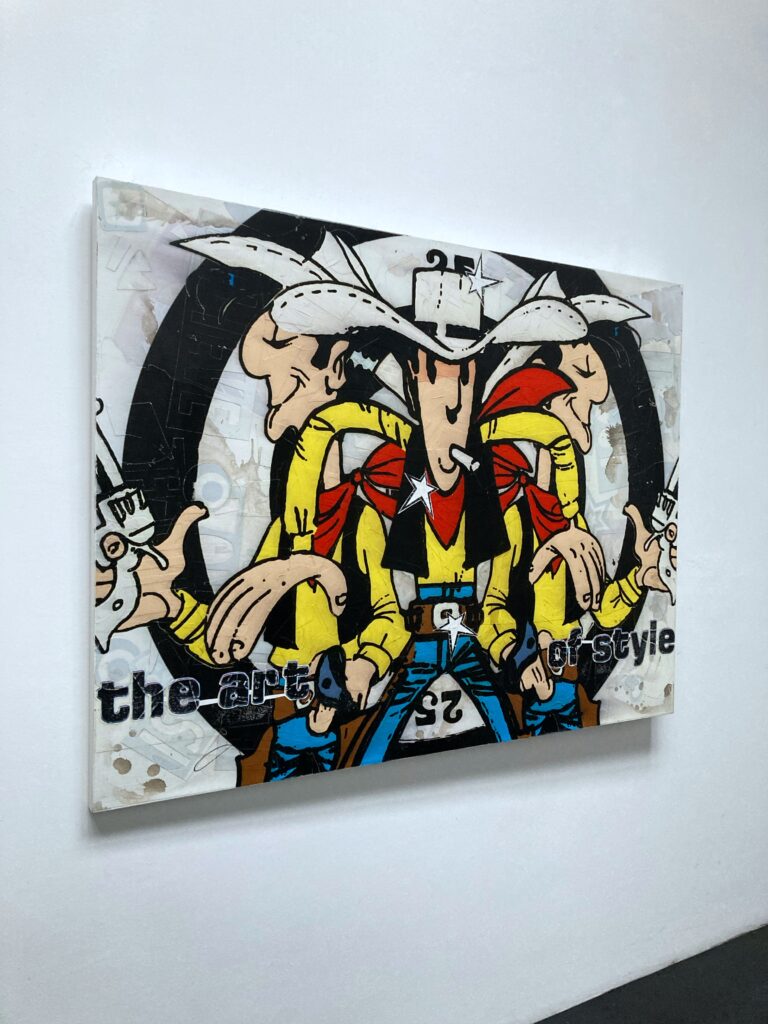 Prachtig groot origineel werk van Jörg Döring uit 2019. Het stuk is met gemengde technieken vervaardigd met een combinatie van een rijke collage van grote originele fotoafdrukken, ruw geschilderde oppervlaktes, typografie en geschreven teksten. Het stuk is vervolgens door de kunstenaar met gemengde technieken nabewerkt waardoor het resultaat uitzonderlijk krachtig en energiek is. ‘The Art of Style’ is vervaardigd op een stevig dubbeldik frame en doorgeschilderd op de zijkanten.
