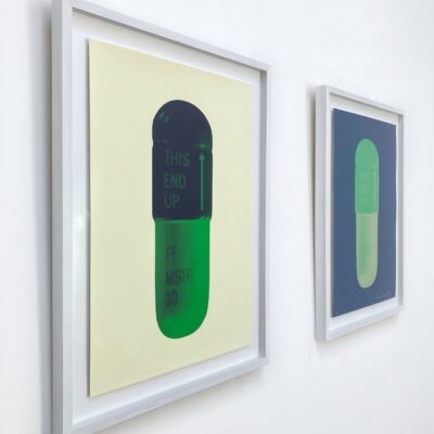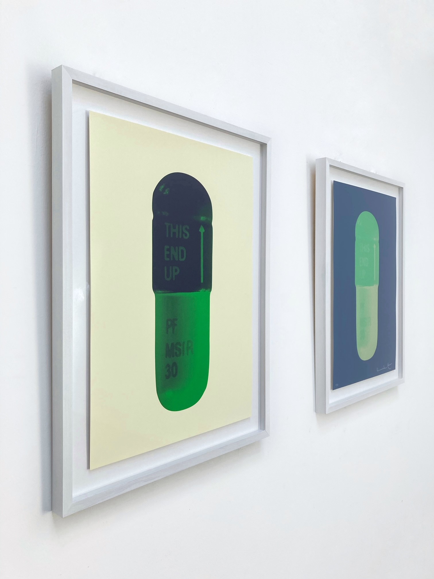 ‘The Cure’ is a set of thirty silkscreen prints, each depicting a two-colour pill set against vibrant backgrounds of pop-candy colors. Hirst’s enduring exploration of contemporary belief systems; religion, love, art and medicine. The manipulation of scale, is just one of the techniques employed by the artist to analyze the confident aesthetic of the pharmaceutical industry.