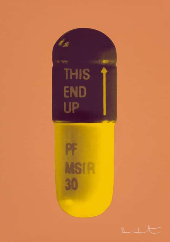 ‘The Cure’ is a set of thirty silkscreen prints, each depicting a two-colour pill set against vibrant backgrounds of pop-candy colors. Hirst’s enduring exploration of contemporary belief systems; religion, love, art and medicine. The manipulation of scale, is just one of the techniques employed by the artist to analyze the confident aesthetic of the pharmaceutical industry.