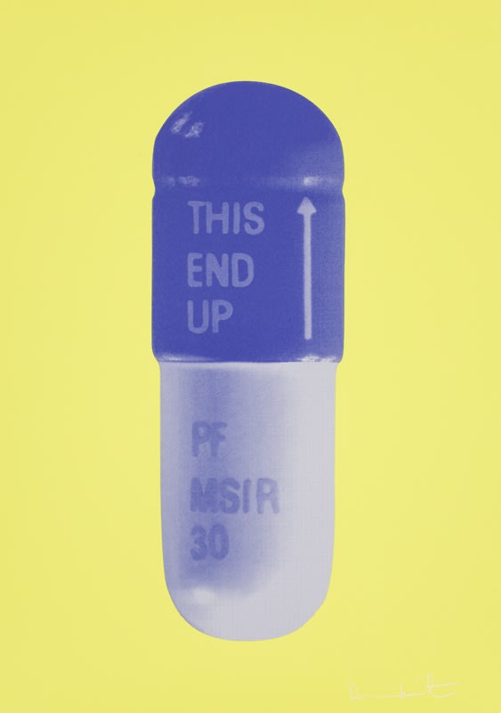 ‘The Cure’ is a set of thirty silkscreen prints, each depicting a two-colour pill set against vibrant backgrounds of pop-candy colors. Hirst’s enduring exploration of contemporary belief systems; religion, love, art and medicine. The manipulation of scale, is just one of the techniques employed by the artist to analyze the confident aesthetic of the pharmaceutical industry.