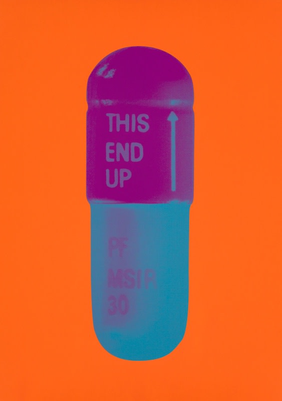 ‘The Cure’ is a set of thirty silkscreen prints, each depicting a two-colour pill set against vibrant backgrounds of pop-candy colors. Hirst’s enduring exploration of contemporary belief systems; religion, love, art and medicine. The manipulation of scale, is just one of the techniques employed by the artist to analyze the confident aesthetic of the pharmaceutical industry.