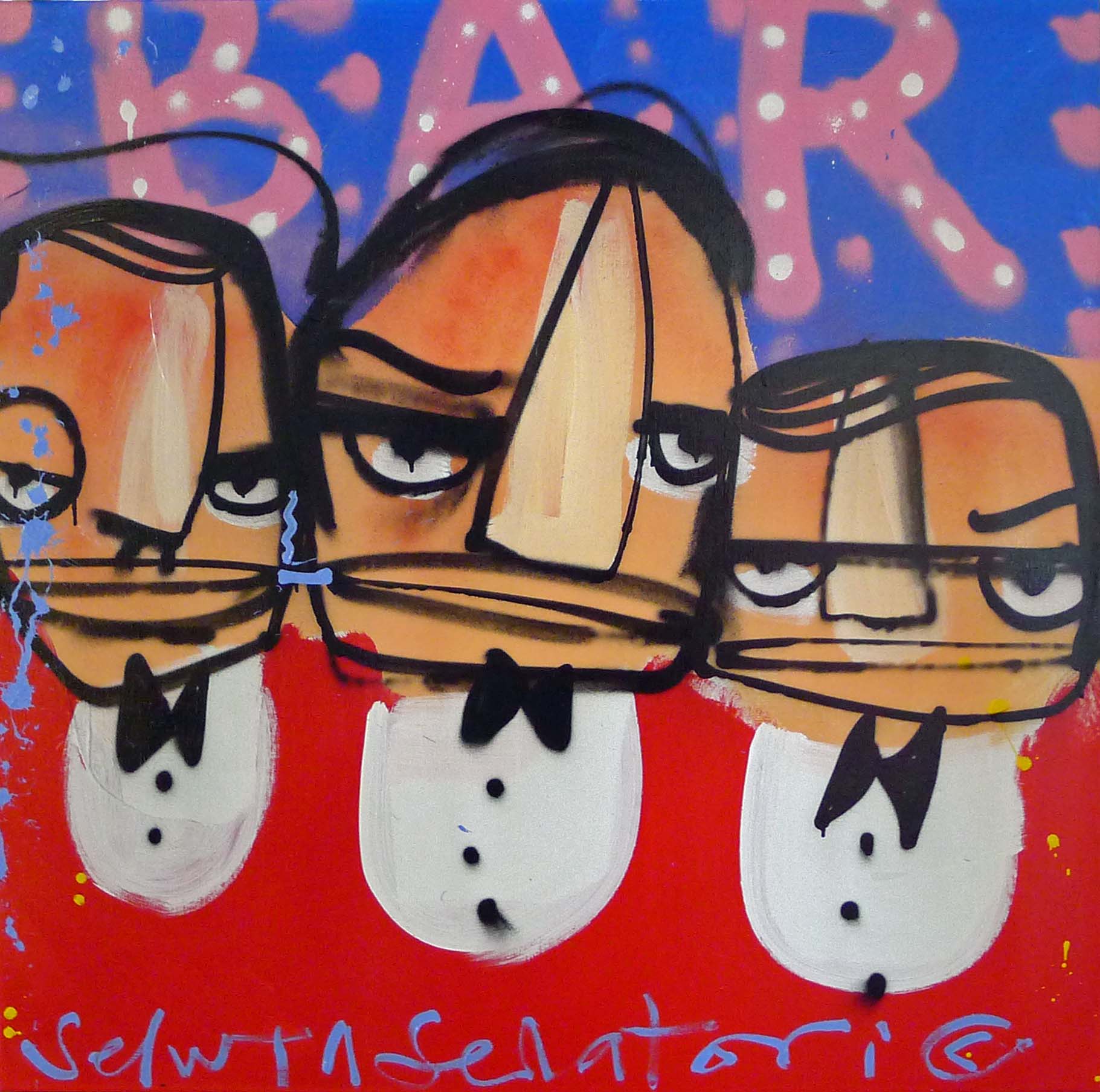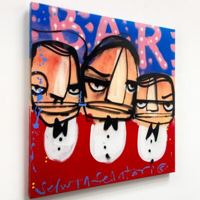 Origineel werk van Selwyn Senatori (2014) in prachtige kleuren. Het stuk is met gemengde technieken opgebouwd met een vlotte, vrije en trefzekere schilderstijl en het krachtige, dynamische kleurgebruik wat zo karakteristiek is voor Senatori’s werk. ‘Three Amigos’is vervaardigd op een dubbeldik opgespannen linnen doek waarvan de zijkanten door Selwyn zijn mee geschilderd.