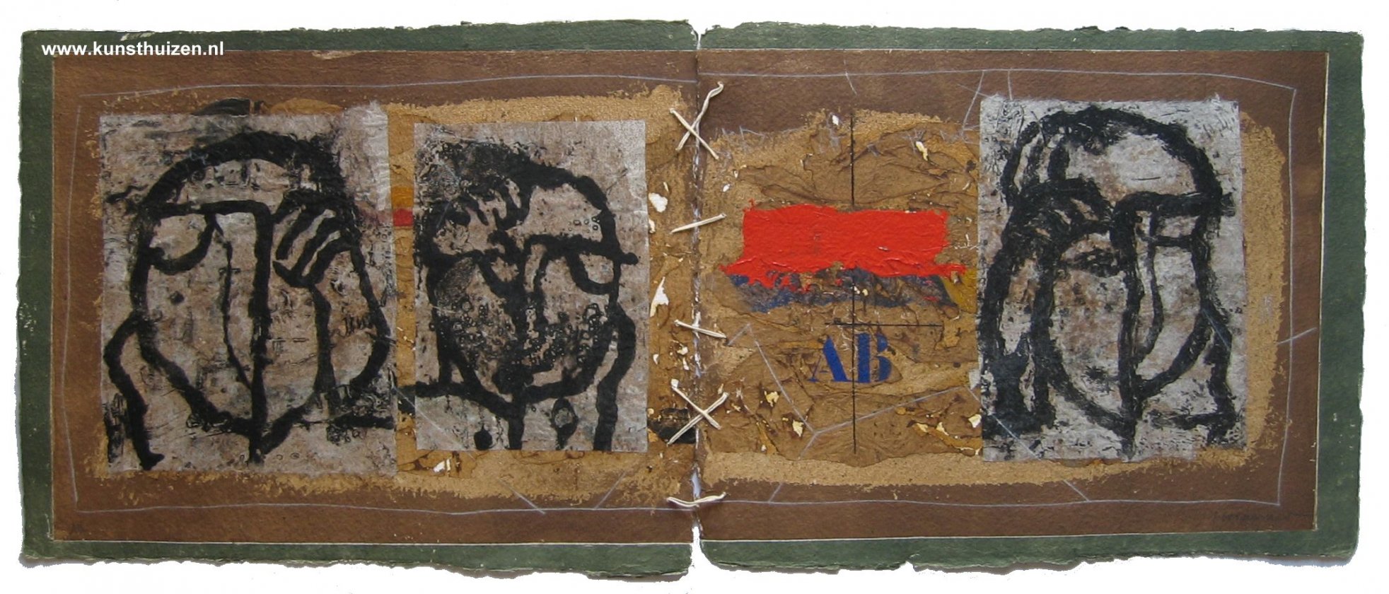 Unieke carborundumlitho van James Coignard. Het stuk is opgebouwd op 2 losse met de hand bewerkte en beschilderde bladen die later door de kunstenaar met canvas aan elkaar zijn geregen. In de bladen zijn schitterende verschillende papiersoorten verwerkt en in de stukken zijn fraaie reliëf-accenten aangebracht! Het stuk is zwevend ingelijst in een mooie bijpassende zilverkleurige lijst.