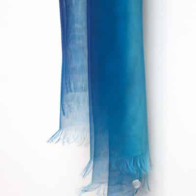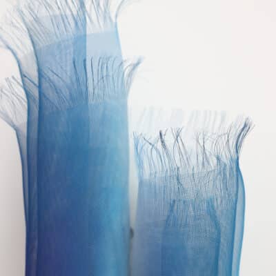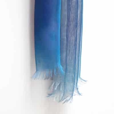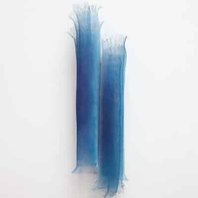 Metaaltextiel en pigment. Twee stroken doorschijnend weefsel ontvouwen zich in diepe blauwtinten die subtiel vervagen naar lichter. De fijne rafelranden benadrukken de kwetsbare elegantie van het materiaal, terwijl het spel van licht en transparantie een bijna etherisch effect oproept. Minimalistisch en poëtisch, een werk dat sereniteit en verfijning in elk interieur brengt.