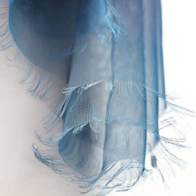 Metal fabric and pigment. Two translucent strips of woven material unfold in deep blue shades that gently fade into lighter tones. The delicate frayed edges enhance the fragile elegance of the medium, while light and transparency create an almost ethereal effect. Minimalist and poetic, this artwork brings serenity and refinement into any space.