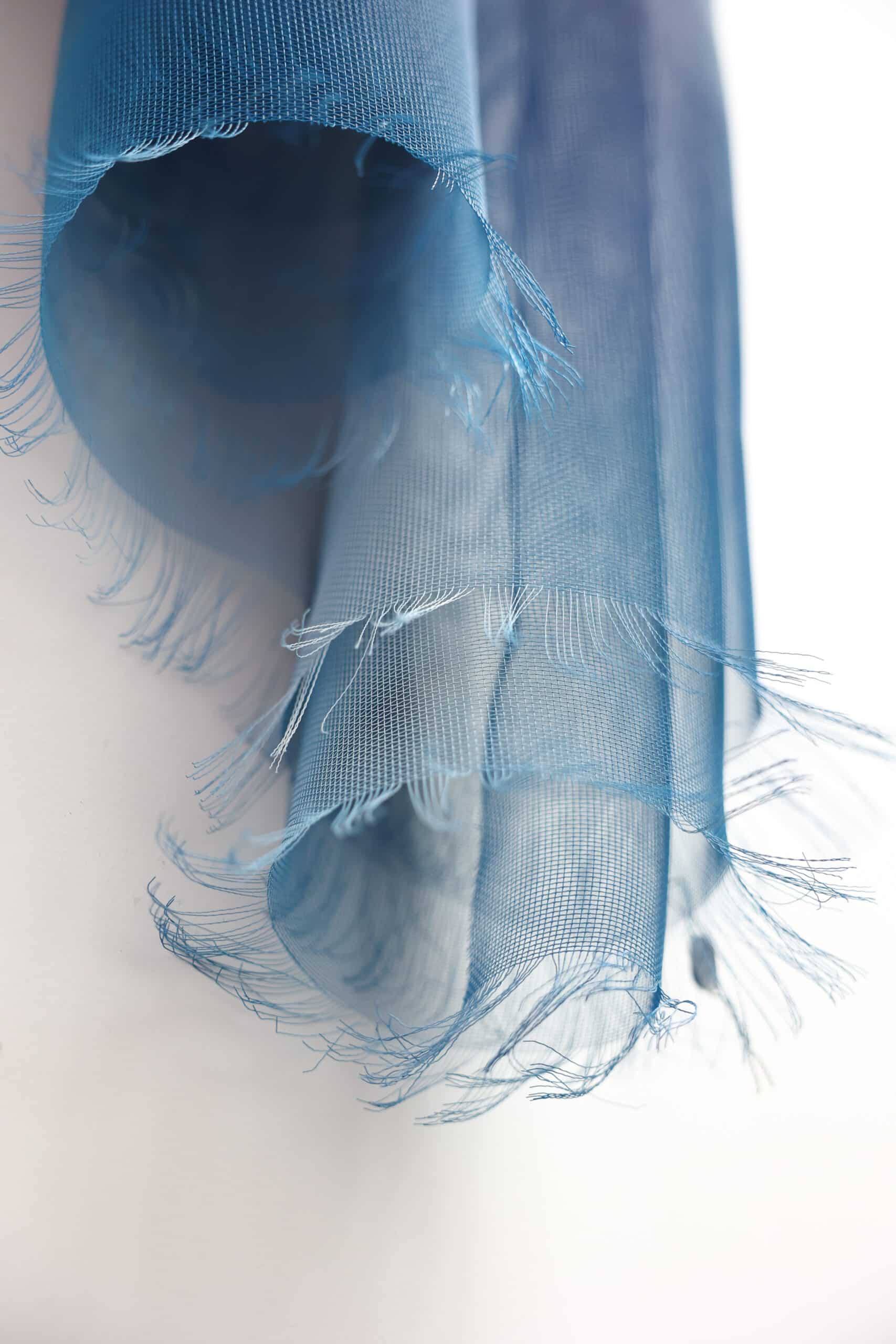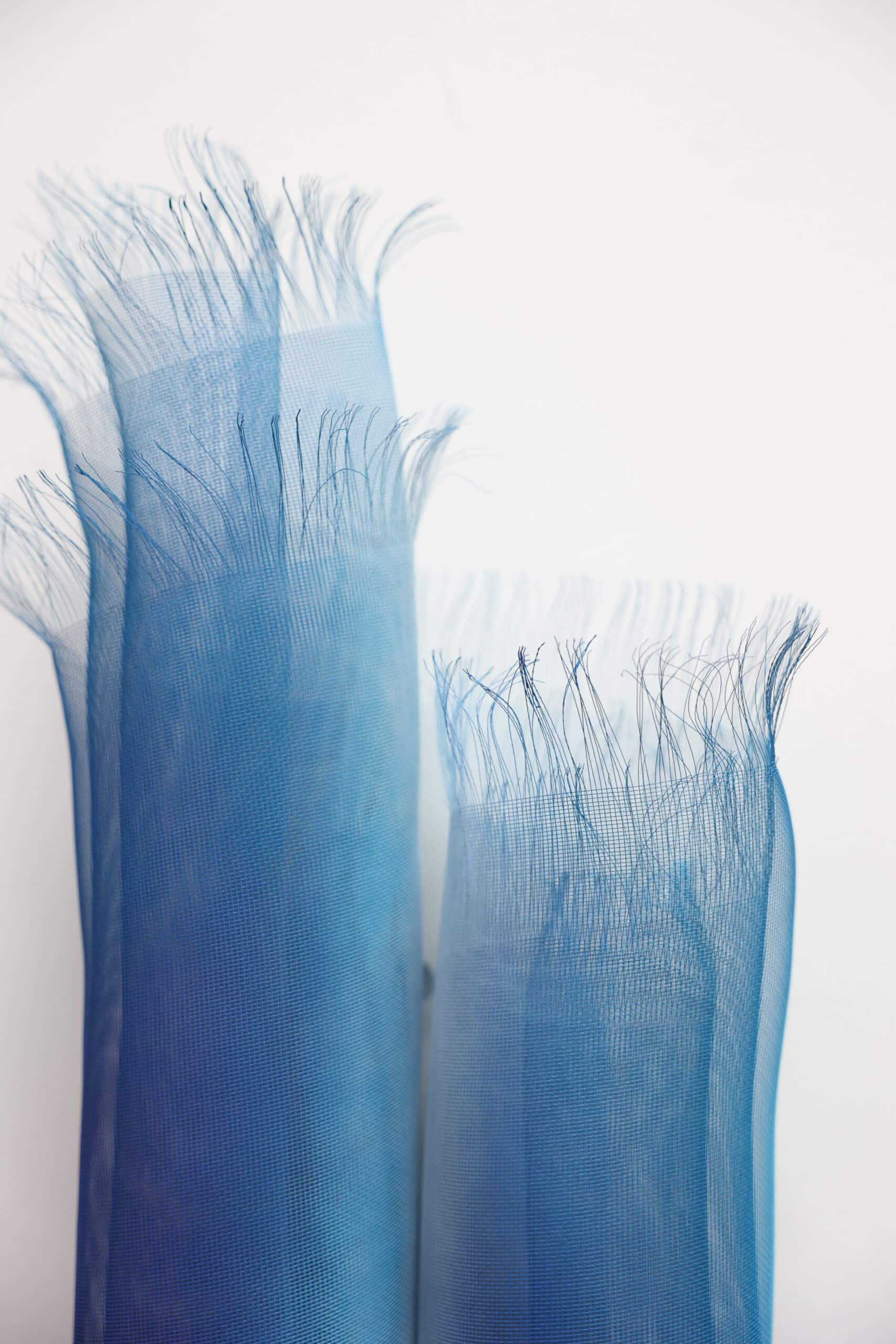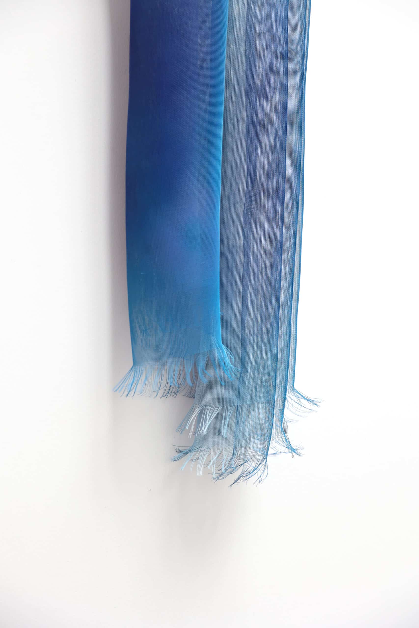 Metal fabric and pigment. Two translucent strips of woven material unfold in deep blue shades that gently fade into lighter tones. The delicate frayed edges enhance the fragile elegance of the medium, while light and transparency create an almost ethereal effect. Minimalist and poetic, this artwork brings serenity and refinement into any space.
