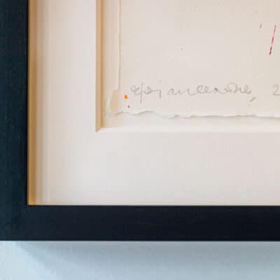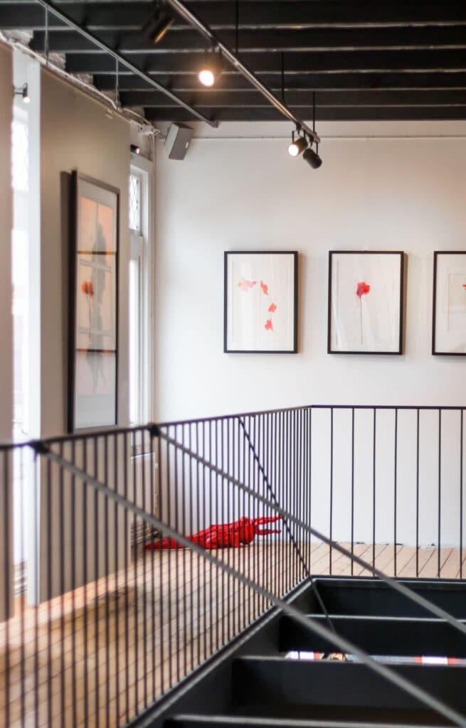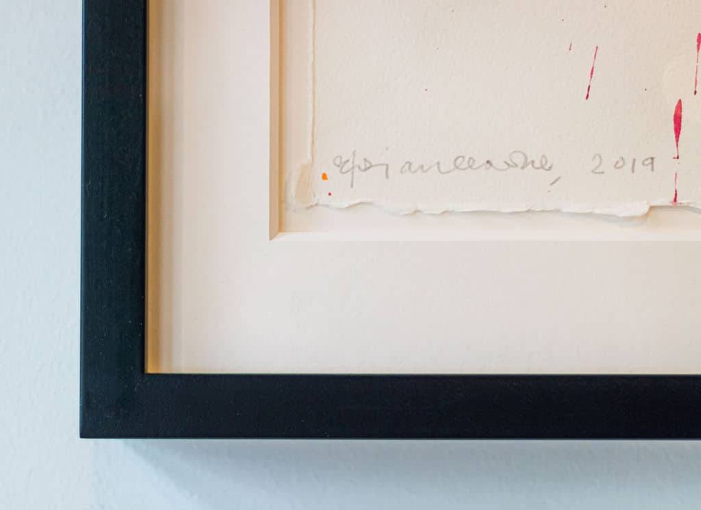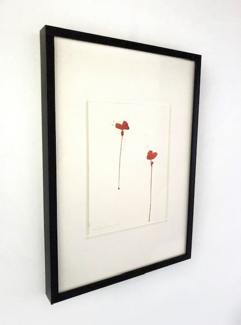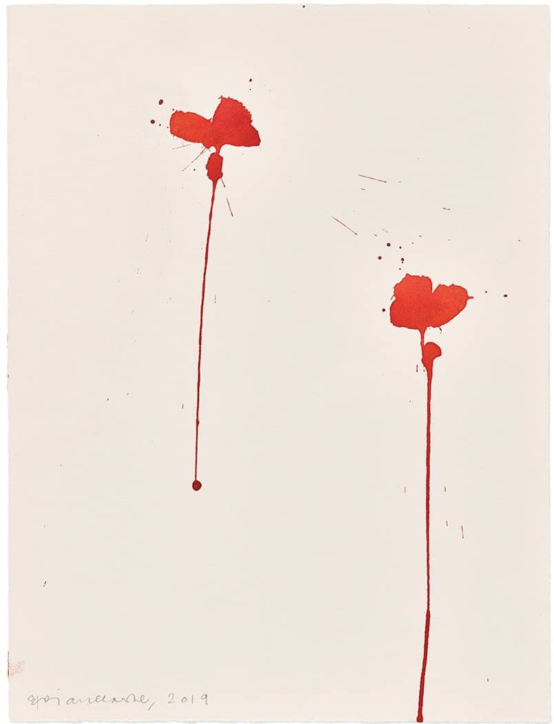 The liquid essence of watercolour in the ‘Vespers’ series (2019), is reminiscent of the transilluminating qualities of his expertise in stained glass. At the first glance Vespers seems to be a series of poppies, with thin green lines and vivid splashes of red clustering on a blank background. Merging form and abstraction through interactions with light and colour, brings the poppies in a state of constant transformation. Through Clarke’s skilful hand, this medium captures the flowers’ feeling of diaphanous membrane.