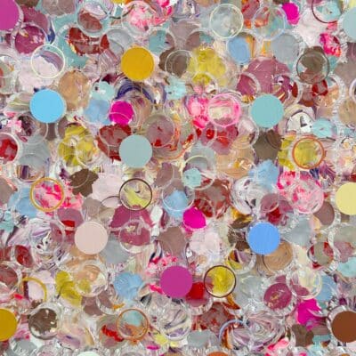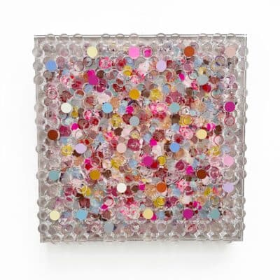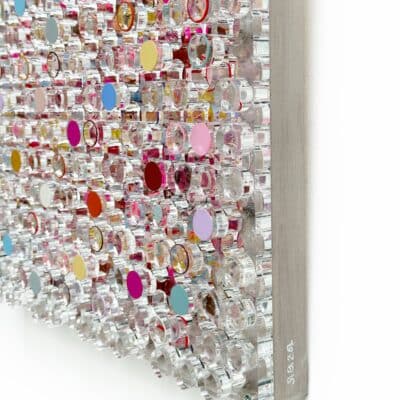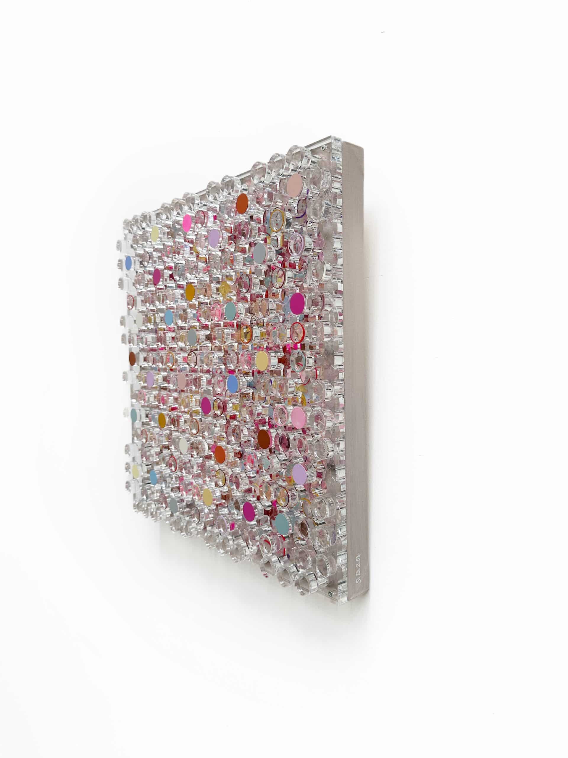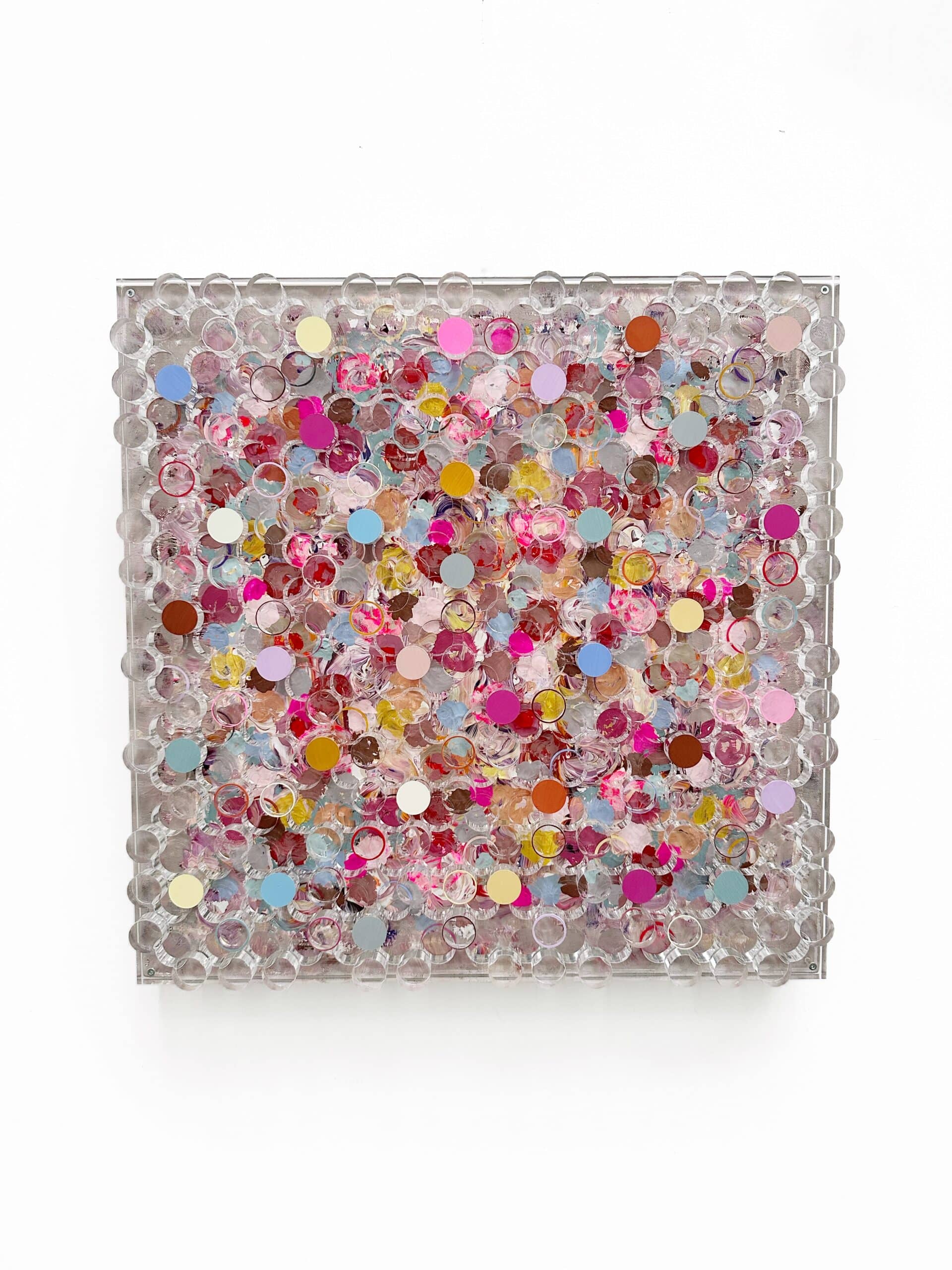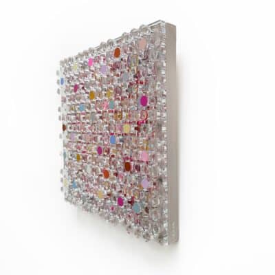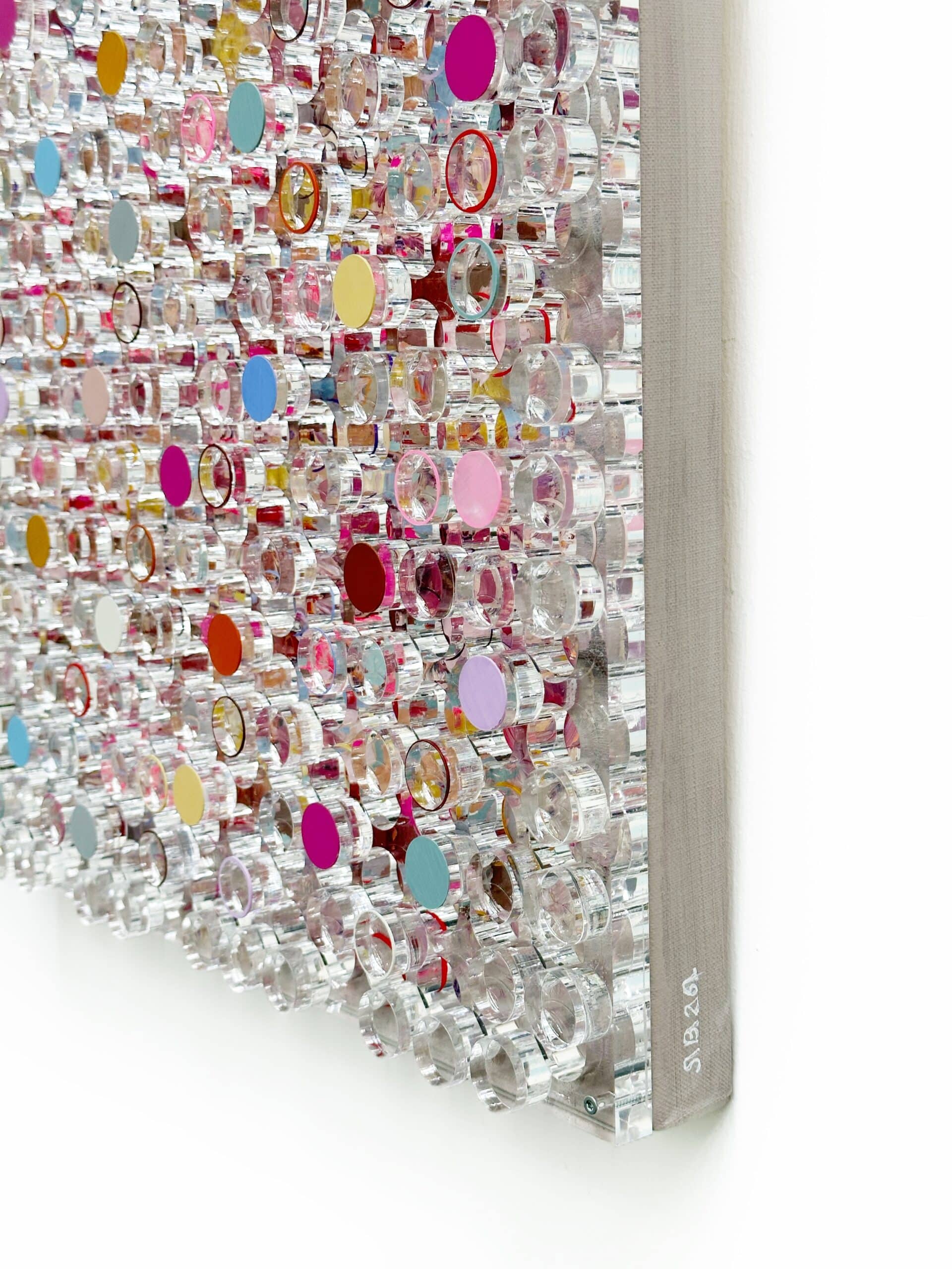 Whispering Blooms, Silvia Strobos. Acryl op doek, afgewerkt met een laser-gesneden plexiglas laag waarvan de uitgesneden elementen deels beschilderd en opnieuw bevestigd zijn. Het werk speelt met transparantie, diepte en ritme. Zachte pasteltinten en levendige accenten vormen een sprankelend geheel dat blijft veranderen met het licht. Een verfijnd en speels object dat elke ruimte een frisse, eigentijdse dynamiek geeft.