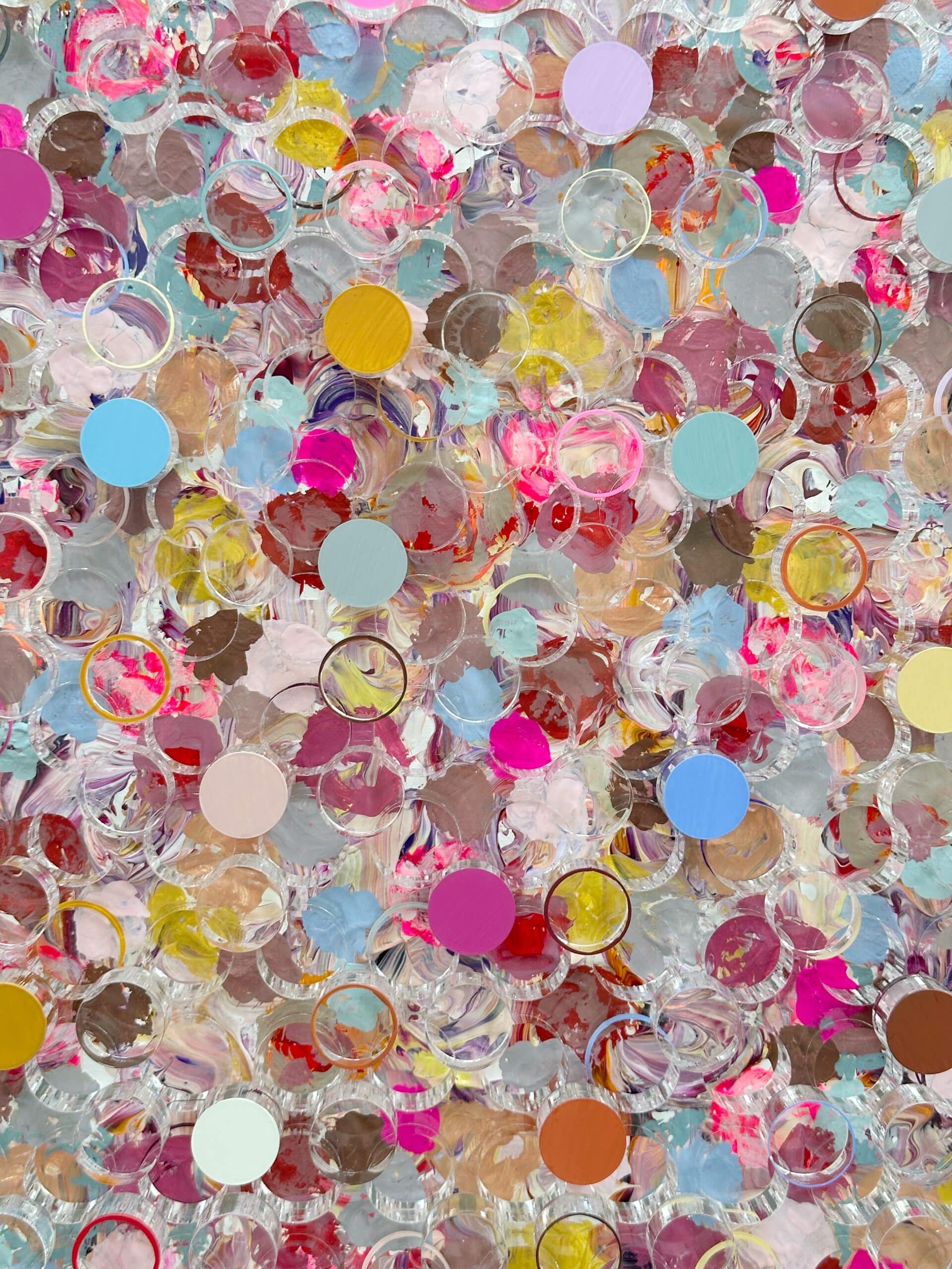 Whispering Blooms, Silvia Strobos. Acrylic on canvas, finished with a laser-cut plexiglass layer, with cut-out elements partly painted and reattached. The work explores transparency, depth, and rhythm. Soft pastels and vivid accents create a shimmering composition that shifts with light. A refined yet playful piece that brings a fresh, contemporary energy to any interior.