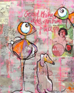 Origineel werk van Willemien Brand, vervaardigd in het najaar van 2011. Werk waarin de kunstenares een mix van gemengde technieken, collages, paintbrush, epoxy, heeft laten samensmelten tot een spannend en dynamisch eindresultaat met de kenmerkende vrolijke en ontwapende knipoog waar Willemien Brand zo bekend om staat.