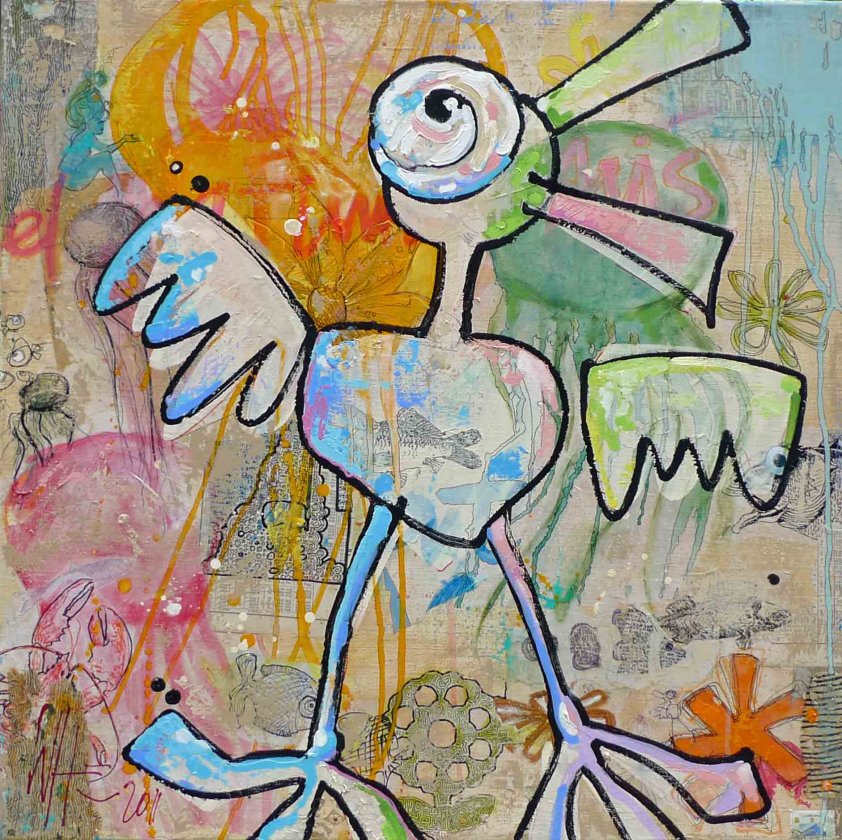 Origineel werk van Willemien Brand, vervaardigd in 2011. “Deltha funky” is 1 van een serie werken waarin de kunstenares een mix van gemengde technieken, collages, paintbrush, epoxy, laat samensmelten tot een spannend en dynamisch eindresultaat. Vanzelfsprekend met nog wel de kenmerkende vrolijke en ontwapende knipoog waar Willemien Brand zo bekend om staat.