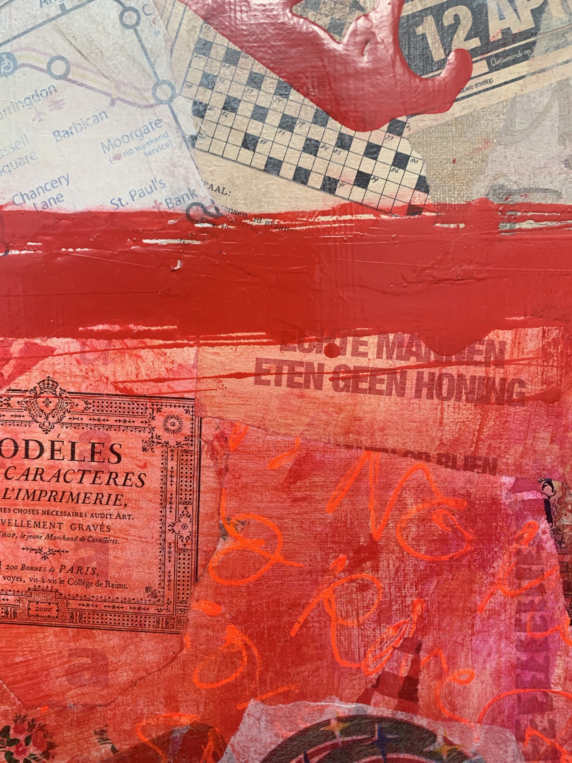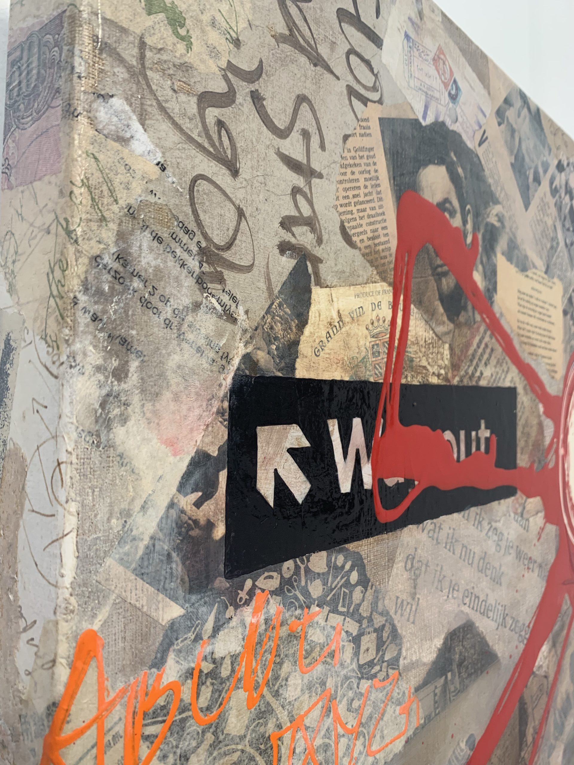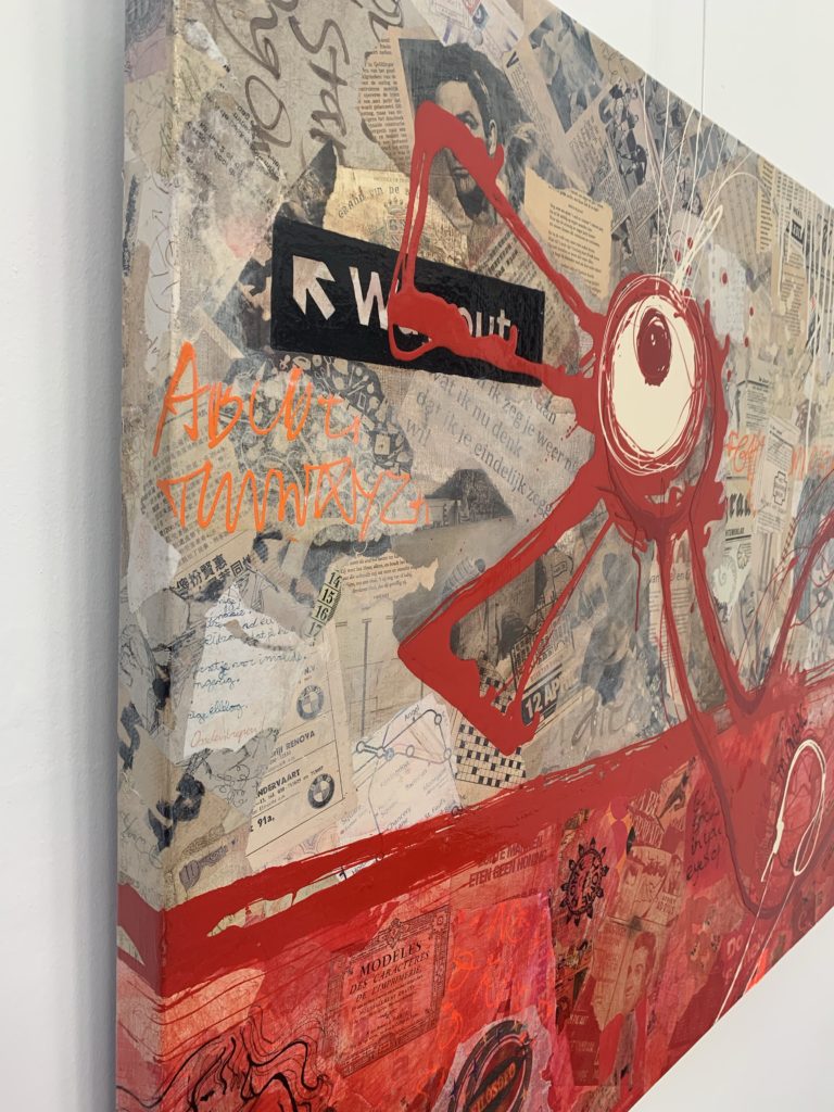 Origineel werk van Willemien Brand, vervaardigd in 2009. “Echte mannen eten geen honing..” is vervaardigd met gemende technieken op een dubbeldik opgespannen linnen doek. De kunstenares speelt op een bijzondere wijze met een mix van technieken (collages, paintbrush, acryl, en inkten) en haar kenmerkende vrolijke en ontwapende figuratie.