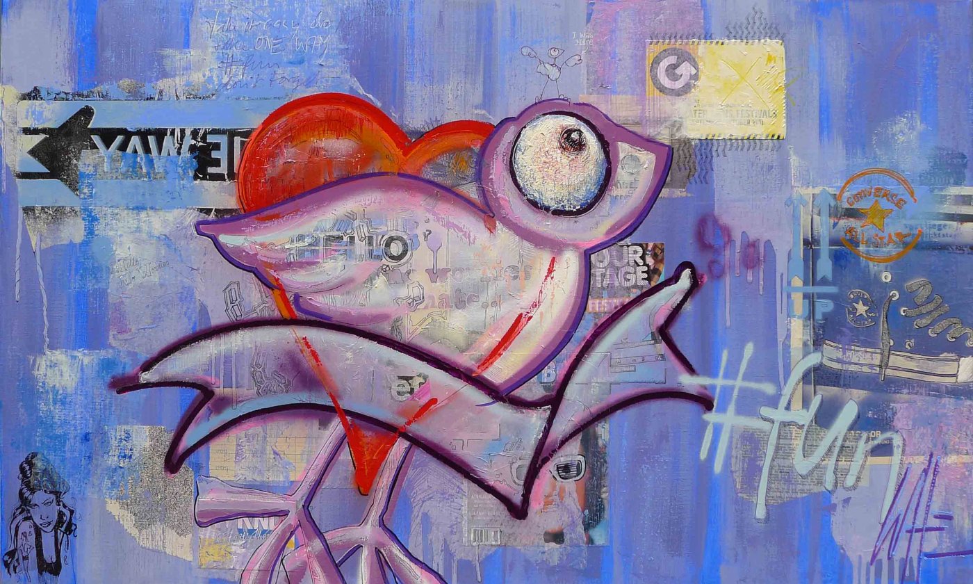 Fraai origineel werk van Willemien Brand, vervaardigd in het voorjaar van 2012. Werk waarin de kunstenares een mix van gemengde technieken, collages, paintbrush, epoxy, heeft laten samensmelten tot een spannend en dynamisch eindresultaat met de kenmerkende vrolijke en ontwapende knipoog waar Willemien Brand zo bekend om staat.
