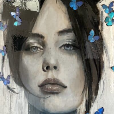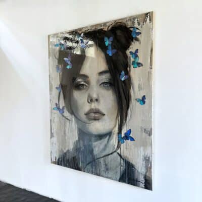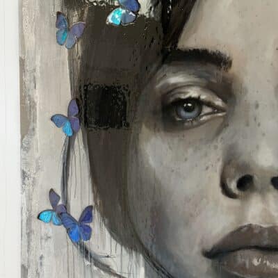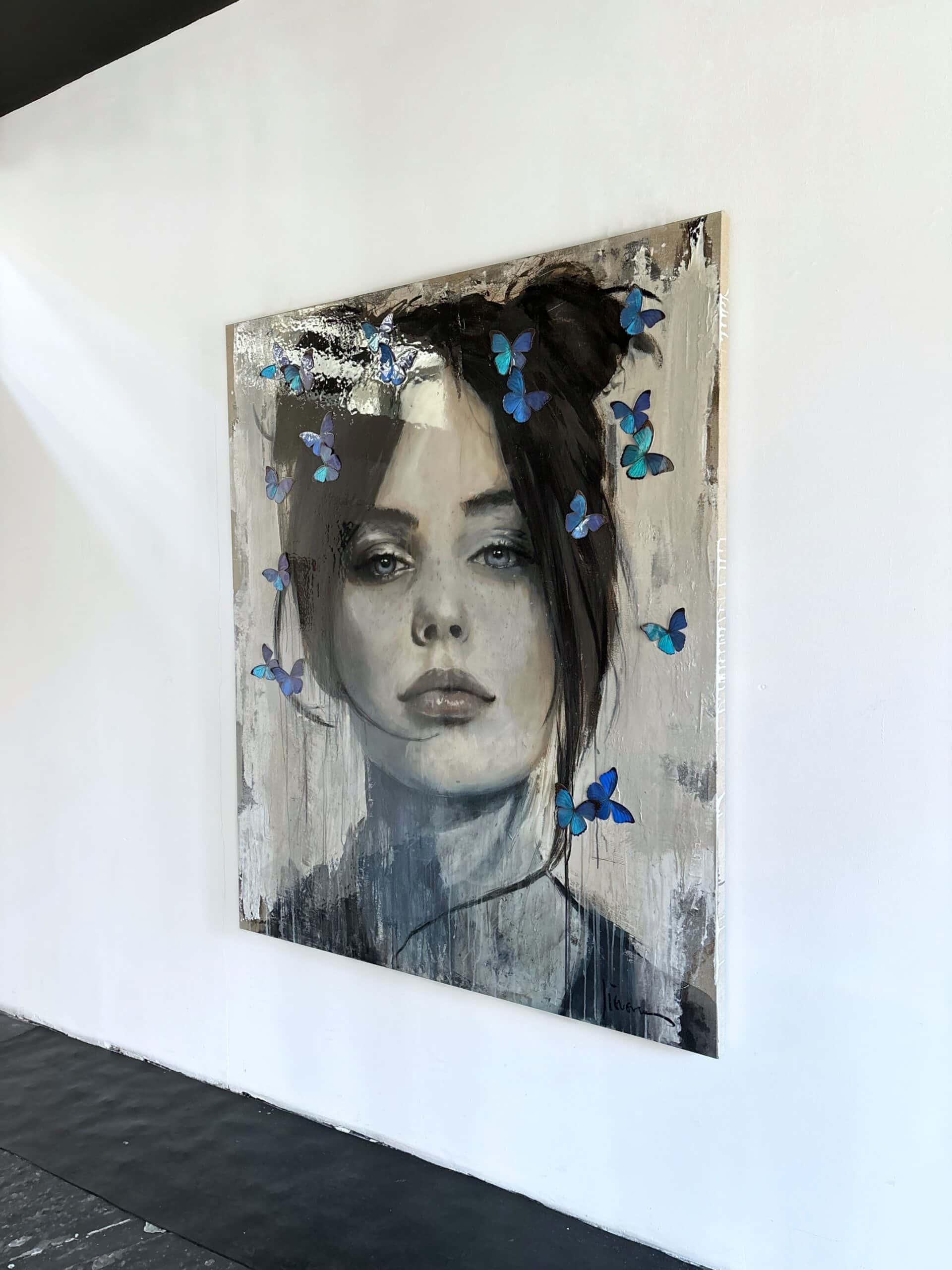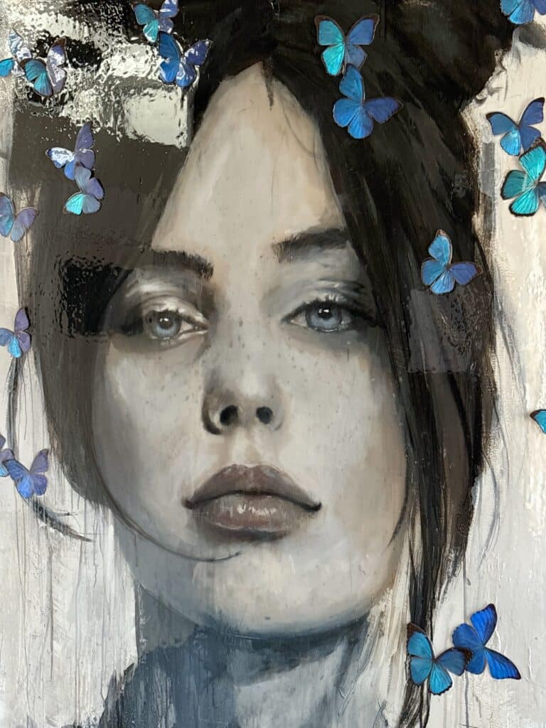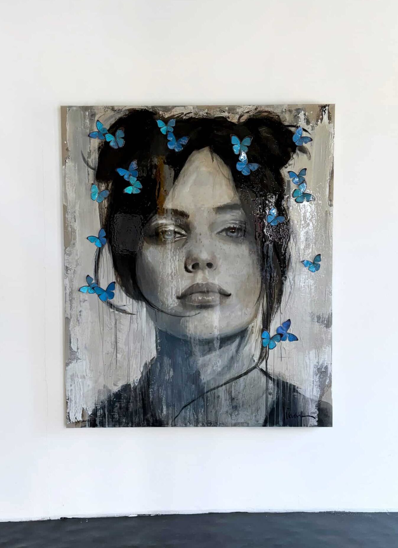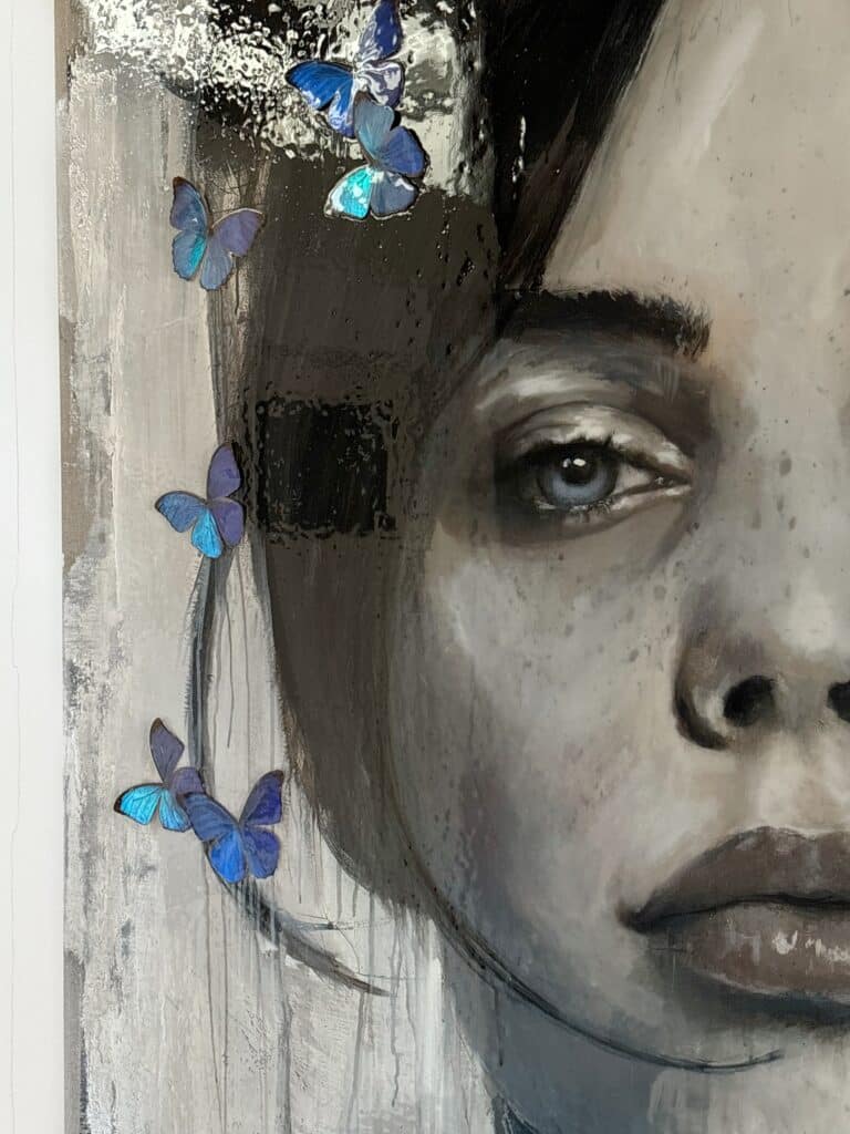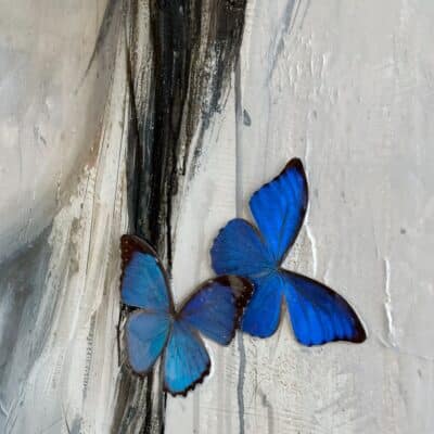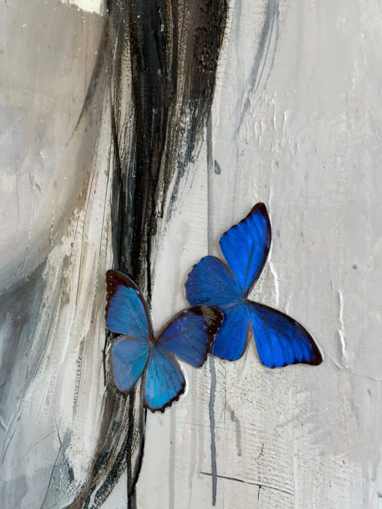 Door het combineren van meerdere lagen textuurrijke verf, gemengde technieken en acryl ontstaat een fascinerende gelaagdheid. De iriserende blauwe vleugels van de Morpho-vlinder symboliseren transformatie en vergankelijkheid. Hoewel het lijnenspel binnen de edities overeenkomt, is elk werk volstrekt uniek.